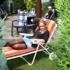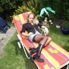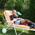 Blondine in Minirock und Nylons liegt im Garten in der Sonne