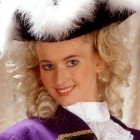 Blondine in einem historischen Kostüm spreizt weit die Beine und verwöhnt ihre Muschi mit ihrem Dildo.