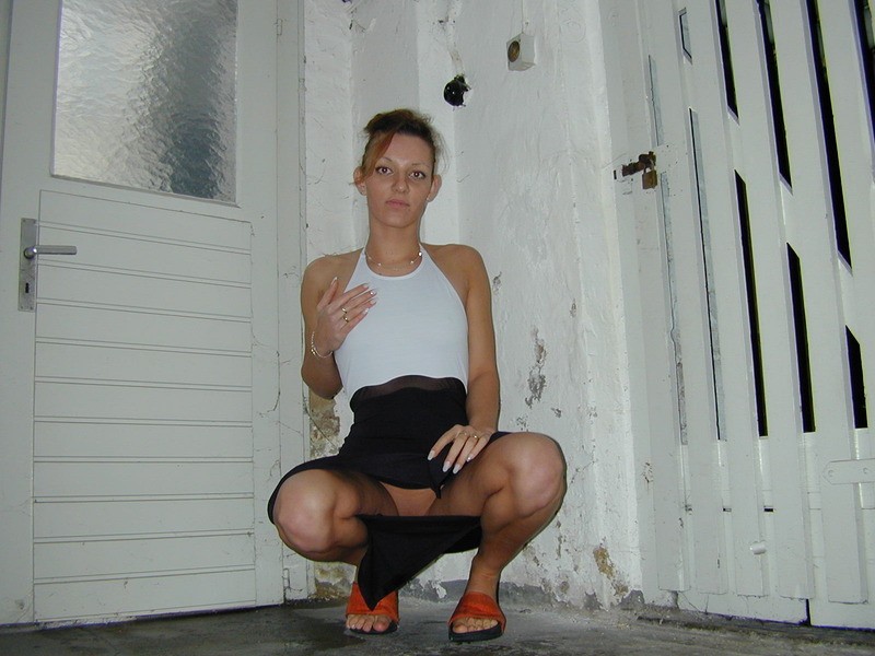 Junge Frau läßt im Keller Muschi, Po und ihre kleinen Titten blitzen